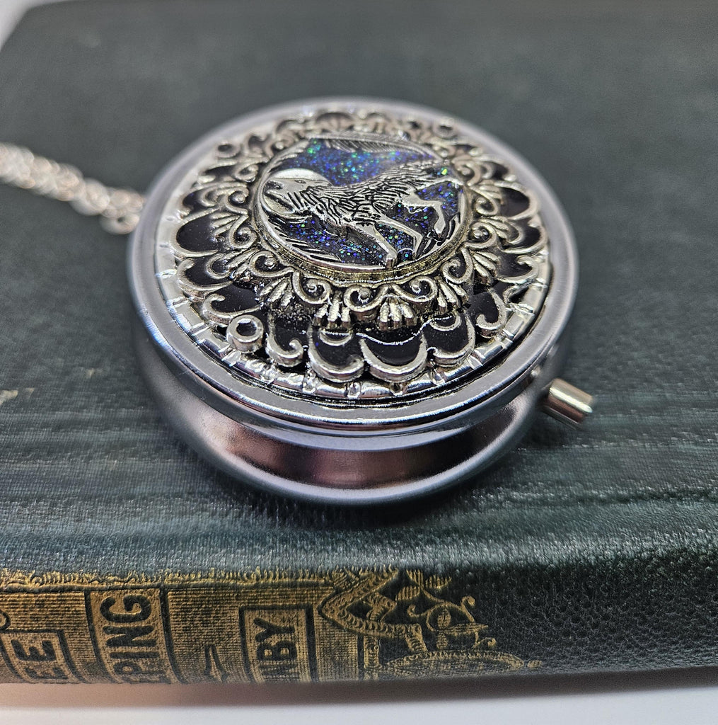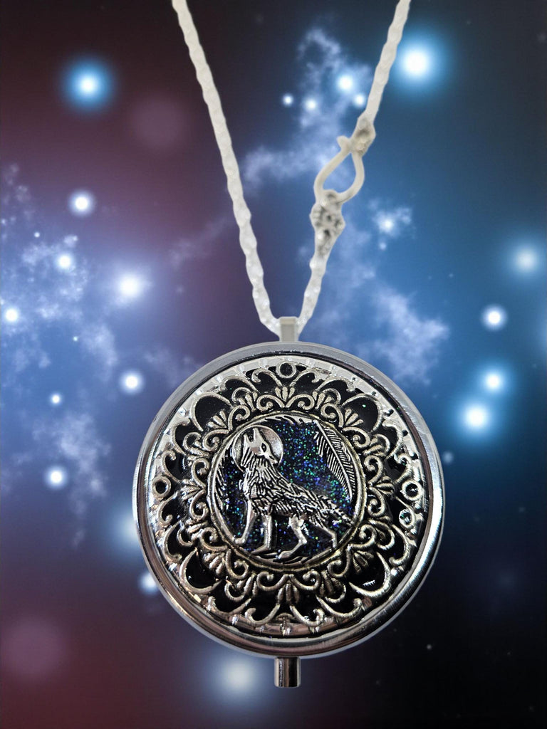 A perfectly round silvertone locket has been adorned with a layer of black shimmering enamel to create the dark night with layers of filigree and a wolf howling at the moon.